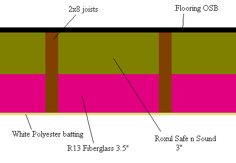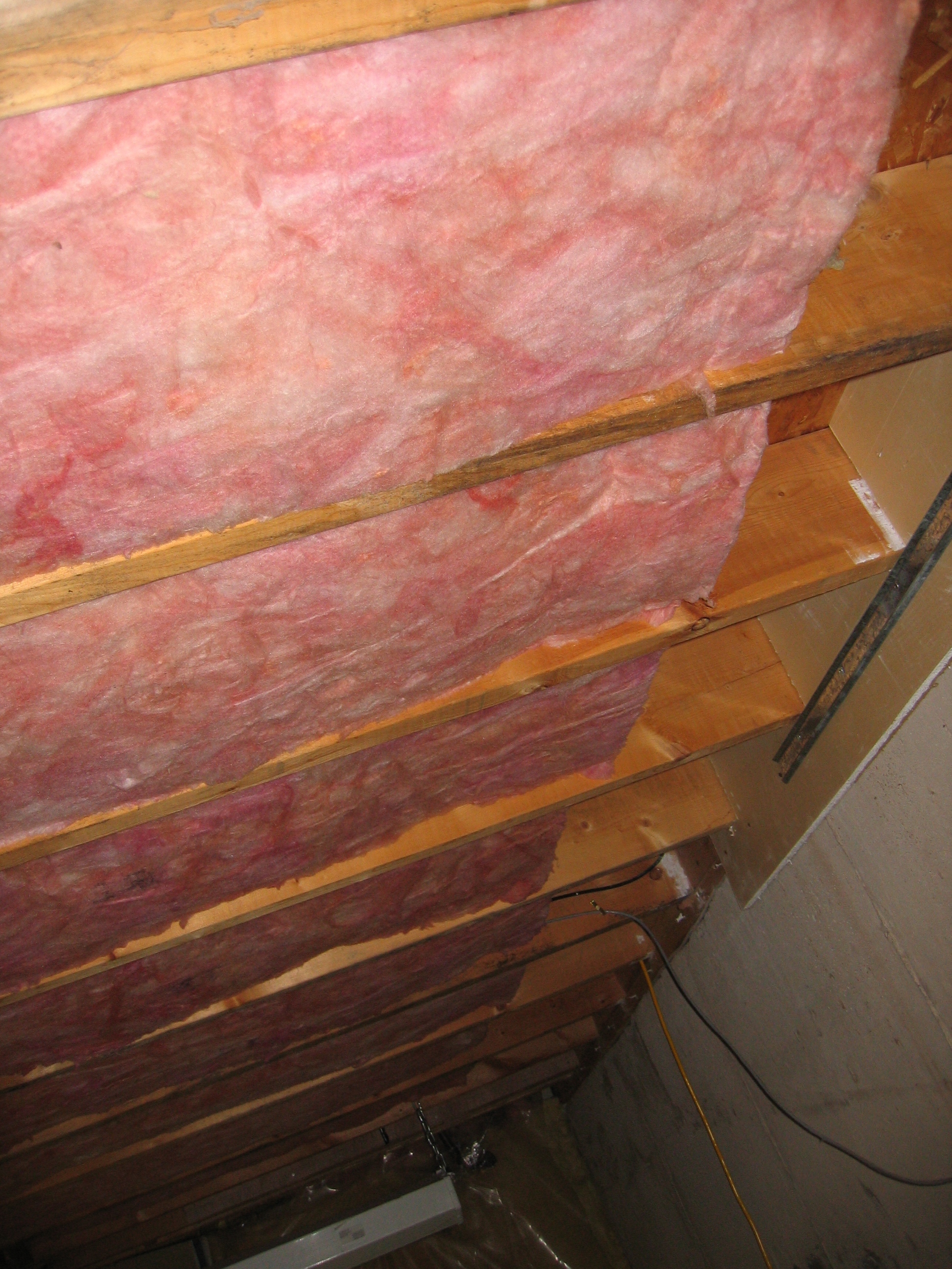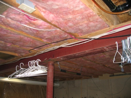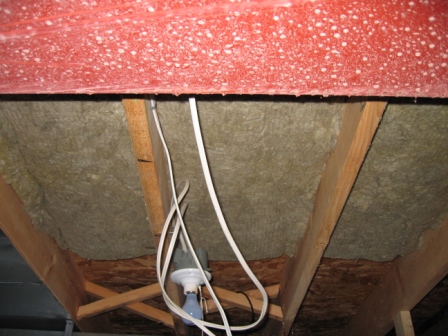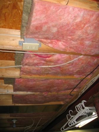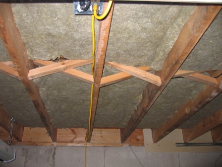 I made a bit of a mistake on the Roxul Safe N Sound. I went looking for 16" centers and that's what I got. Unfortunately it was for steel studs, so it was a bit wide, but it seems to stay up there very well. Probably a bit more dust landed on the floor pushing it up there though.