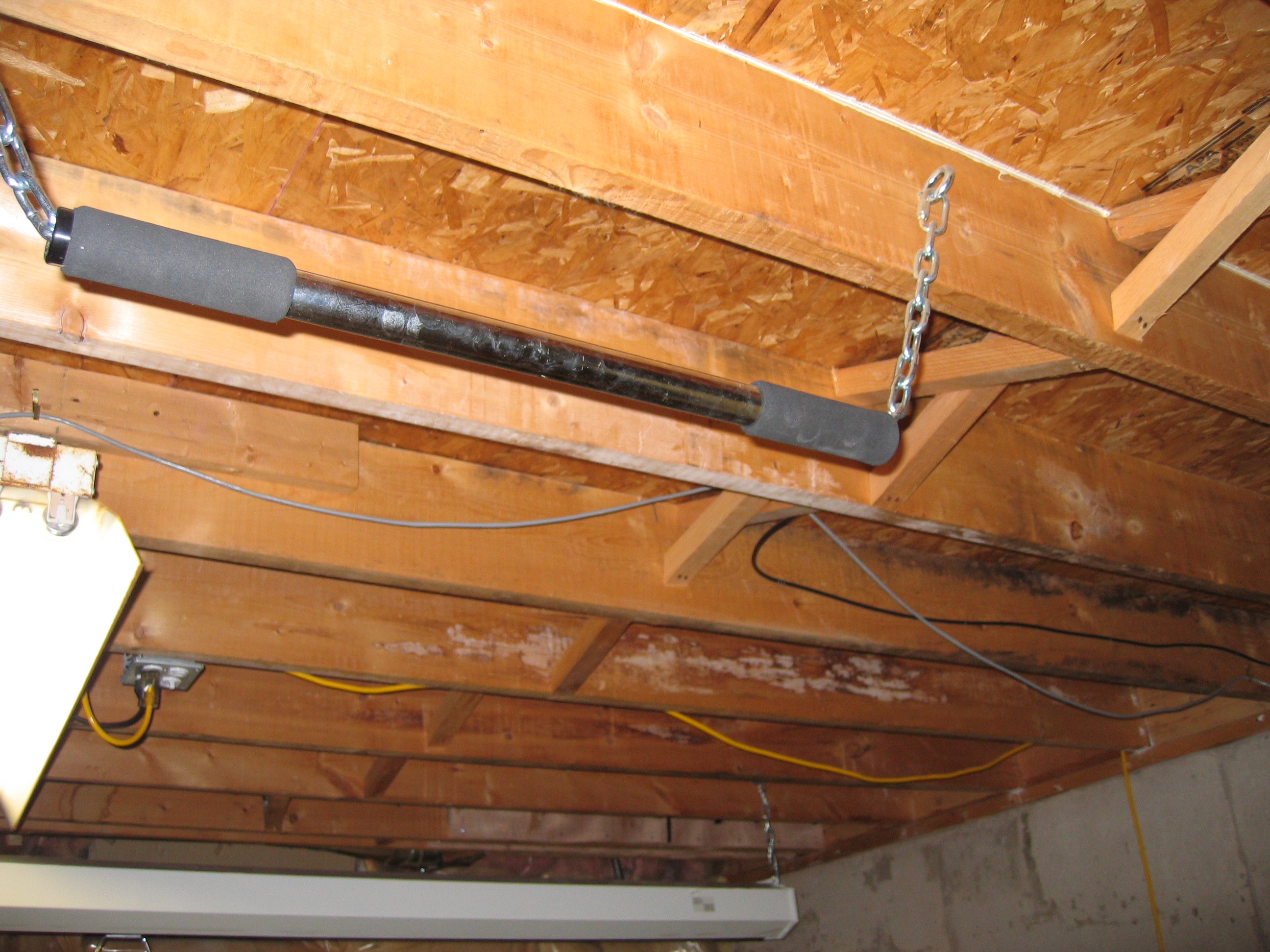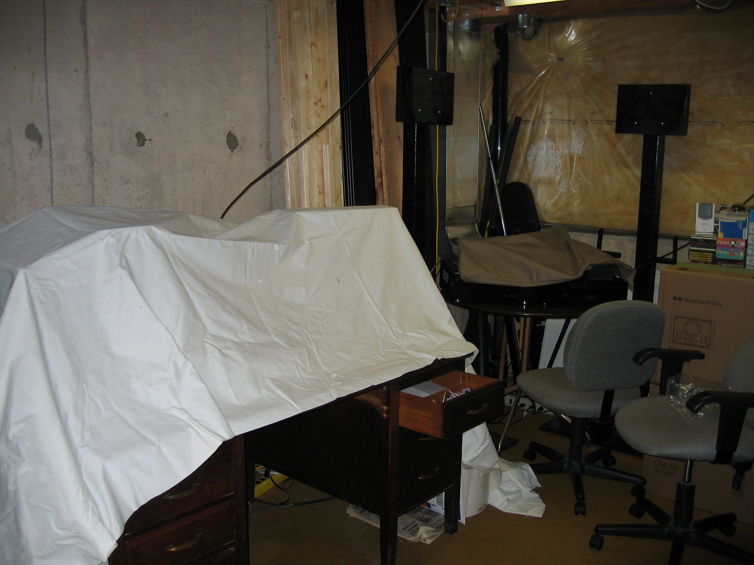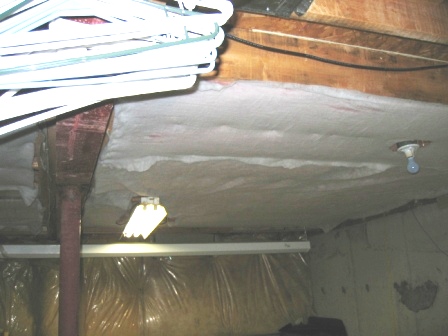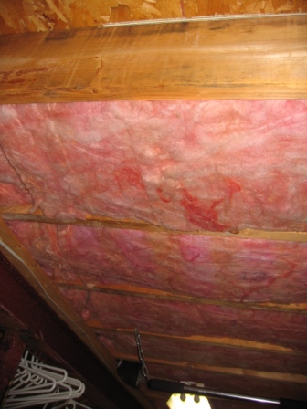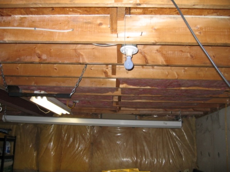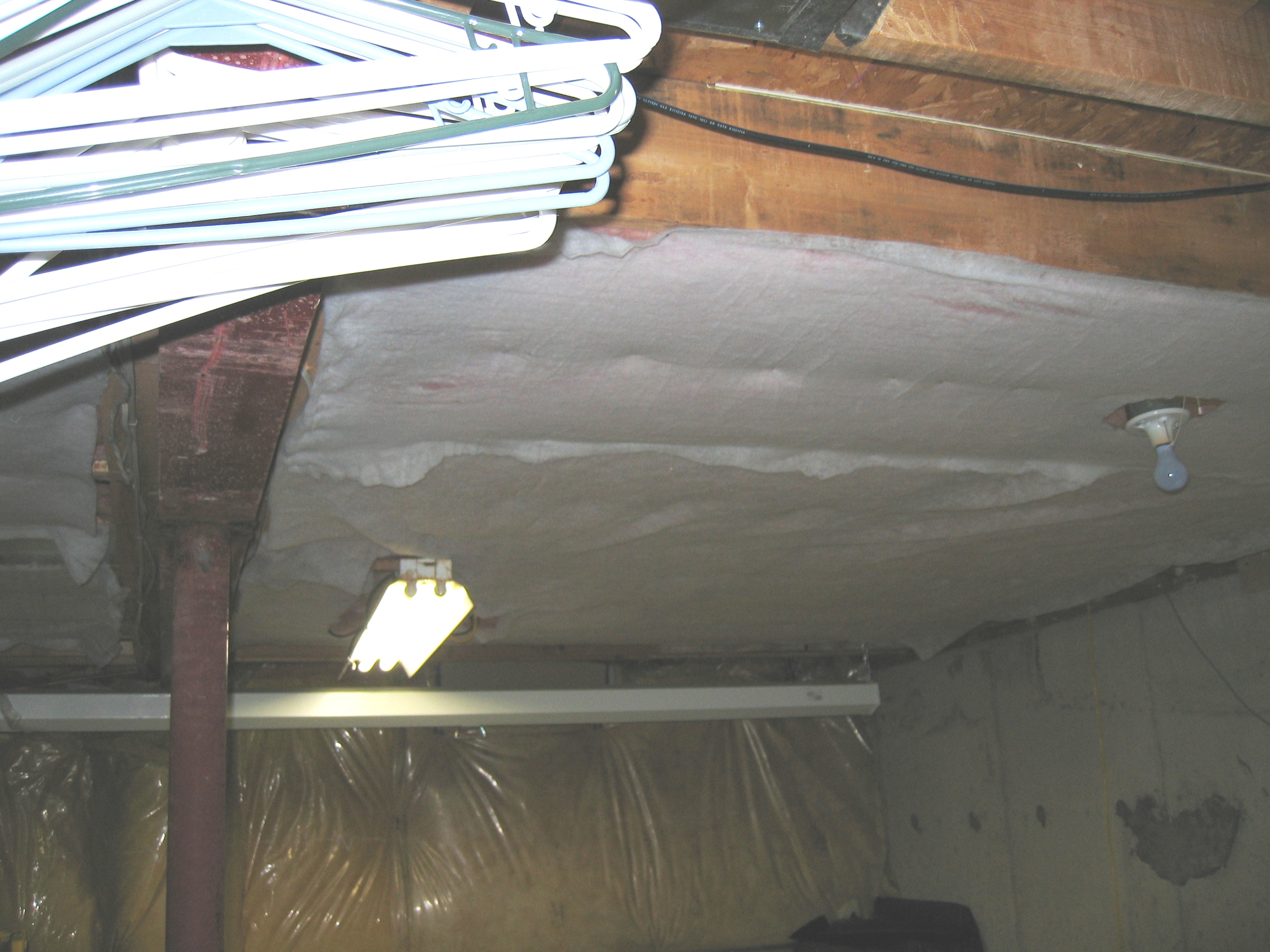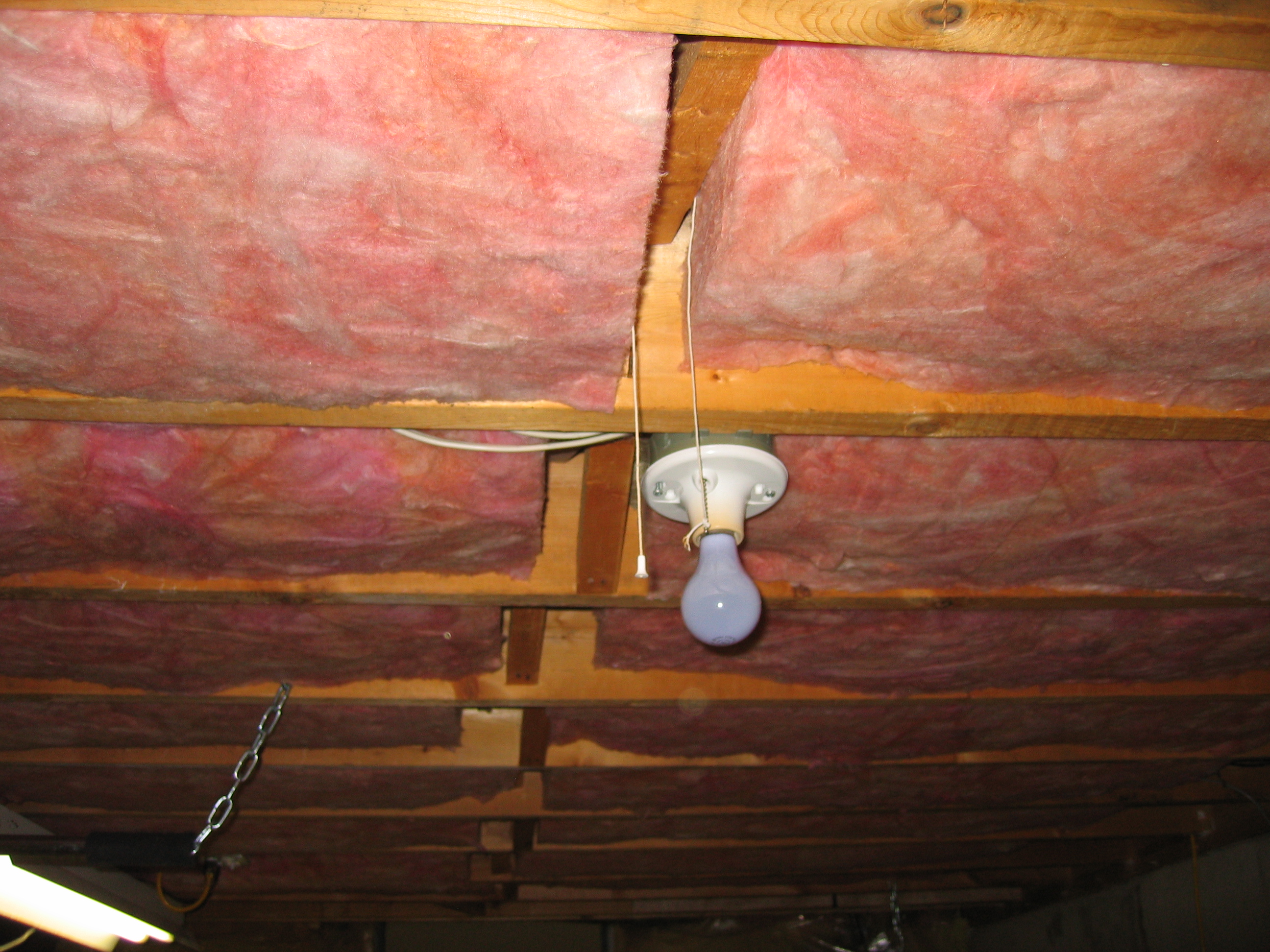 stapled up the polyester to keep the fiberglass fibers off the floor. Cut out around electrical (fire). There's no polyester above the fluorescent light, but the fluorescent is touching the pink fiberglass. The fluorescent is cool except above the balast which is quite warm. I'm considering lowering the fluorescent by an inch.