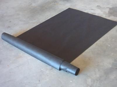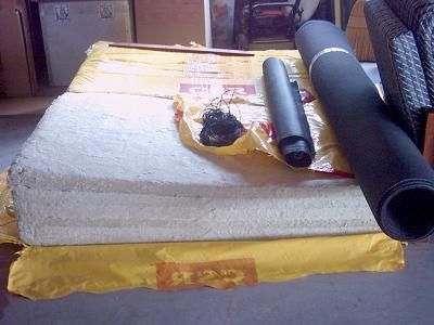 The "rigid" rockwool (Bradford Fibretex 450, 50mm boards), some sofa-lining fabric (a manufactured tissue) and black car carpet. |