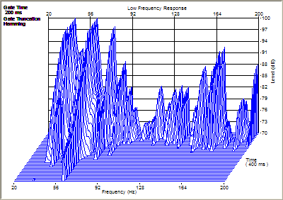Bass reverberations of my untreated studio. I am not 100% confident in the accuracy of this analysis, every time I run the test I get different results. However the comparison does give some indication of the benefit. |